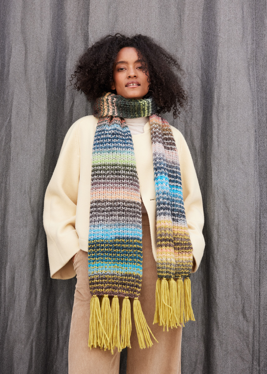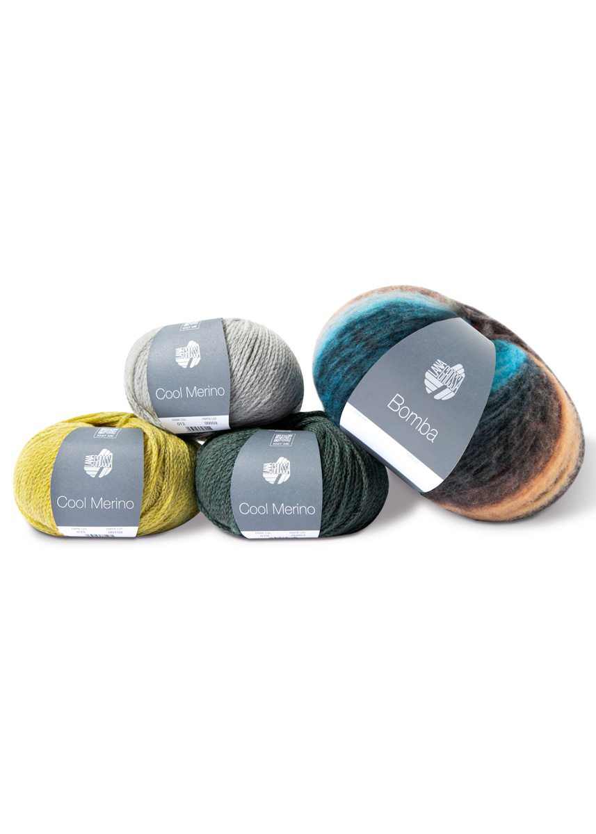 Hilo Lana Grossa, "Bomba" (85 % lana merino extrafina), 15 % poliamida, 290 m/100 g): 100 g (1 ovillo) en el color 7 (melocotón/blanco/verde claro/oscuro/gris petróleo/marrón/azul turquesa); "Cool Merino" (90 % lana merino), 10 % poliamida, 150 m/50 g): 50 g de cada uno en el color 19 (verde), 50 g en el color 33 (amarillo) y 50 g en el color 13 (gris claro).