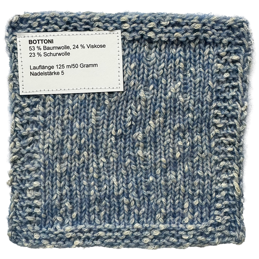 Bottoni tiene un carácter especial: en su interior combina una suave mezcla de algodón y viscosa, envuelta por una fina capa de delicadas fibras de merino. Los motas dispersas aportan toques juguetones y le dan al hilo su aspecto vivo e inconfundible.
