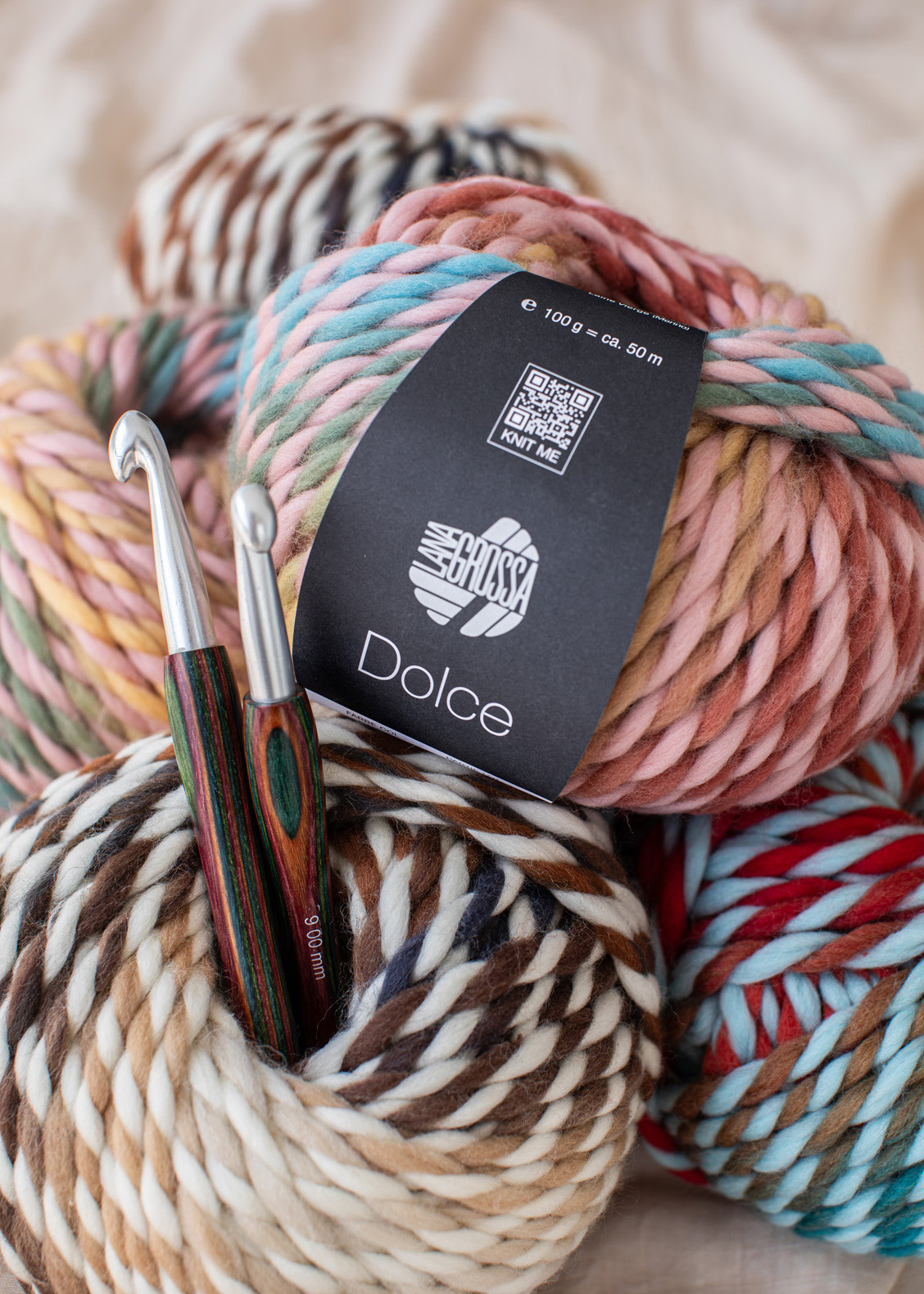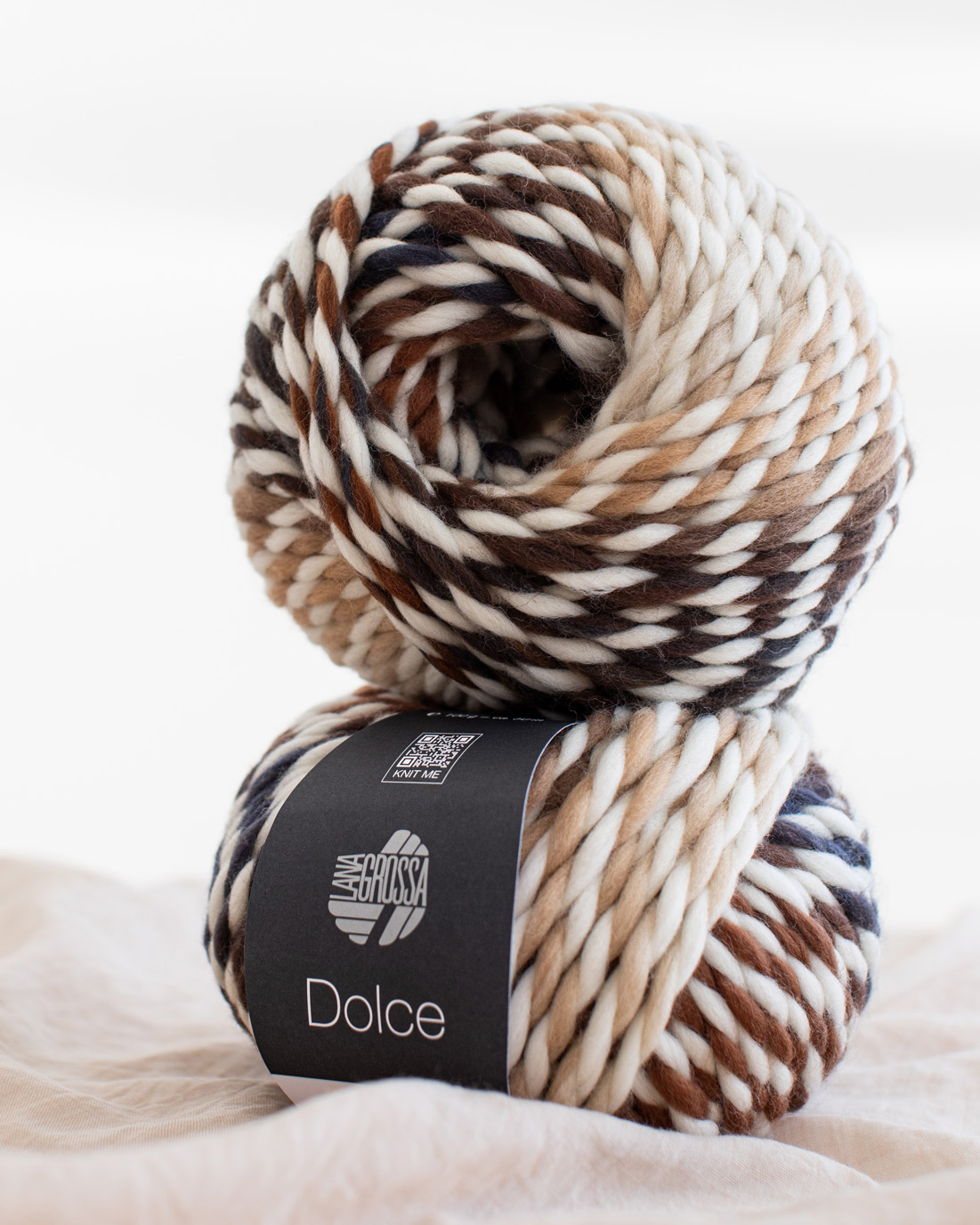 Gracias a su estructura especialmente gruesa, se pueden tejer jerséis, chaquetas y accesorios modernos en un abrir y cerrar de ojos. Su aspecto único con rayas marcadas y efectos mouliné da carácter a cada proyecto. Imprescindible para quienes aman los hilos invernales voluminosos. Lana Grossa Dolce es especialmente adecuada para principiantes.