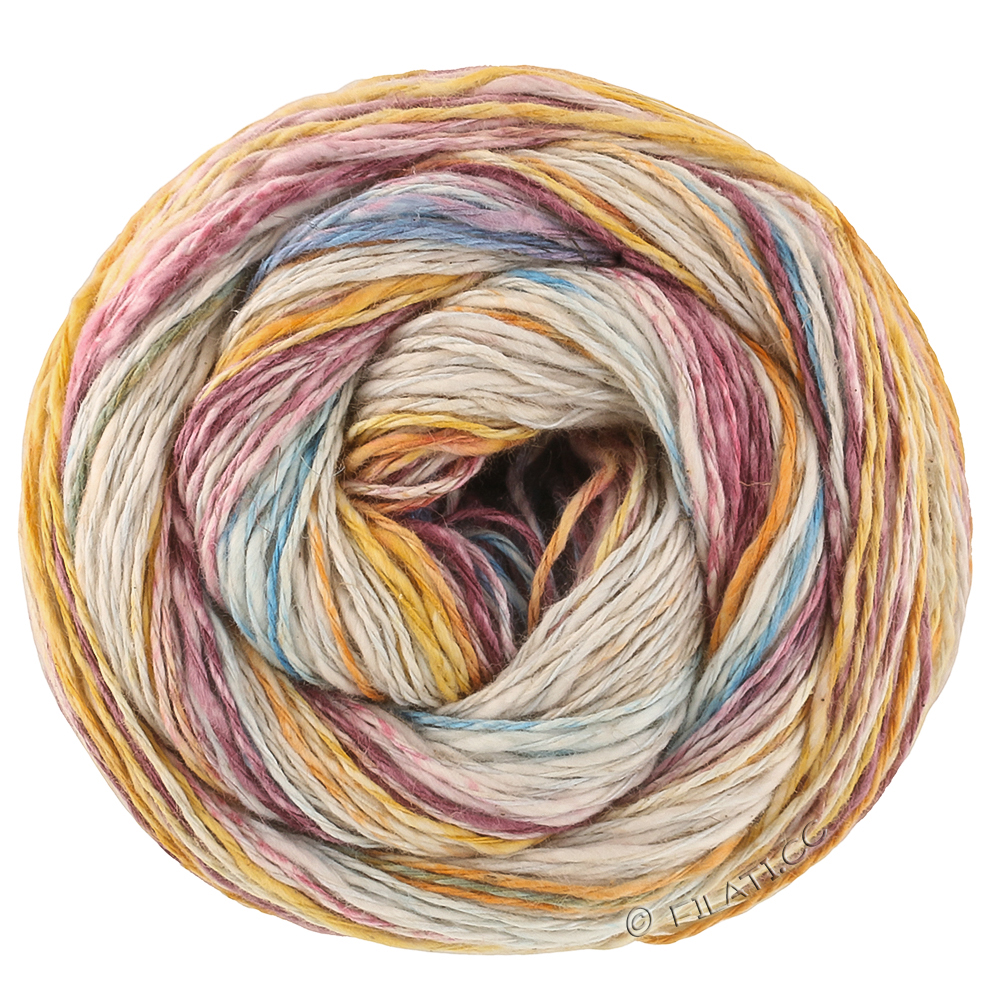 Hilo de algodón-lino estructurado con fibras de cáñamo y estampado de rayas con efecto colorido directamente del ovillo.